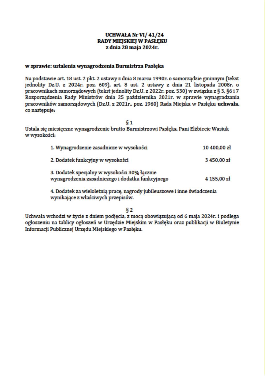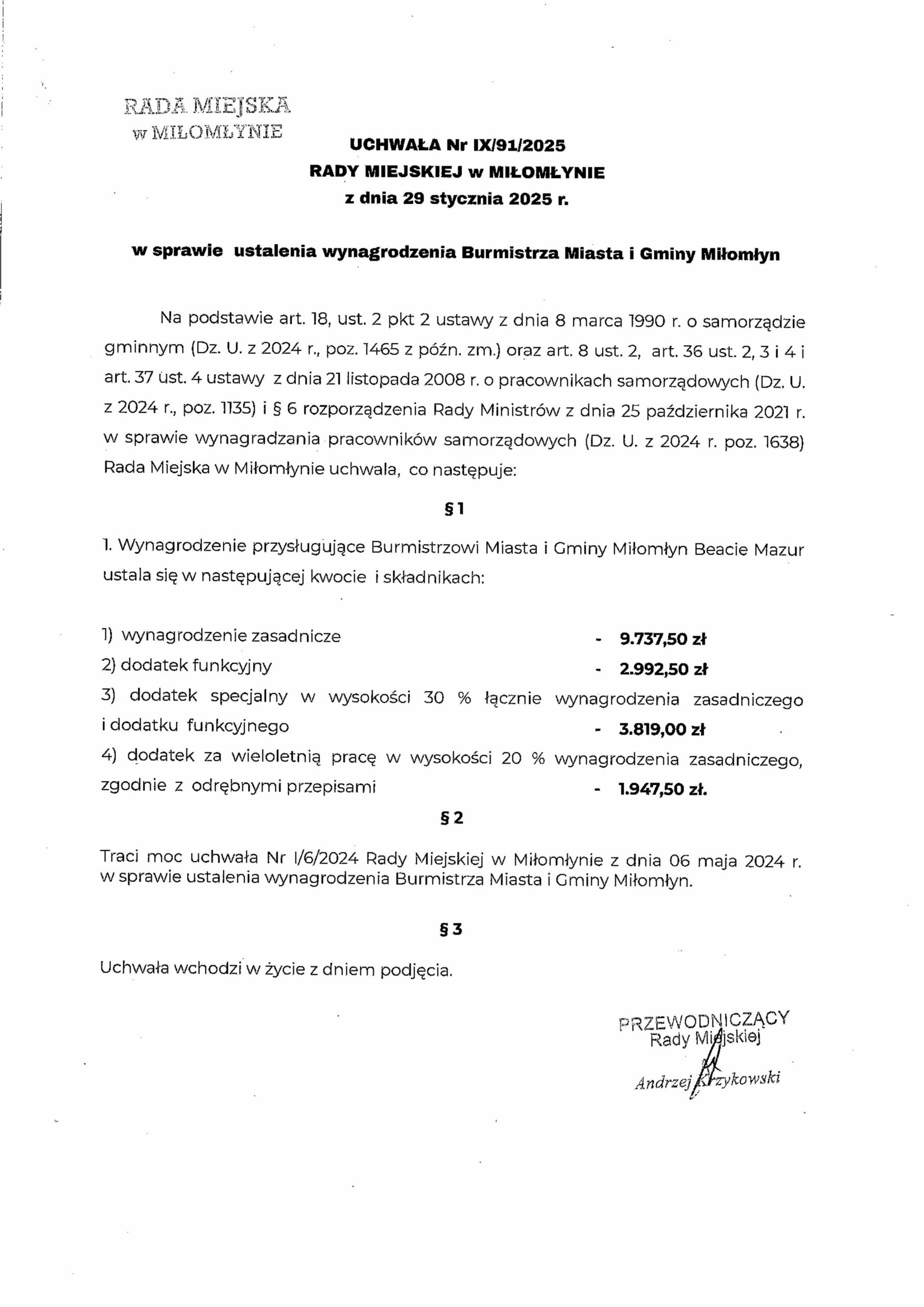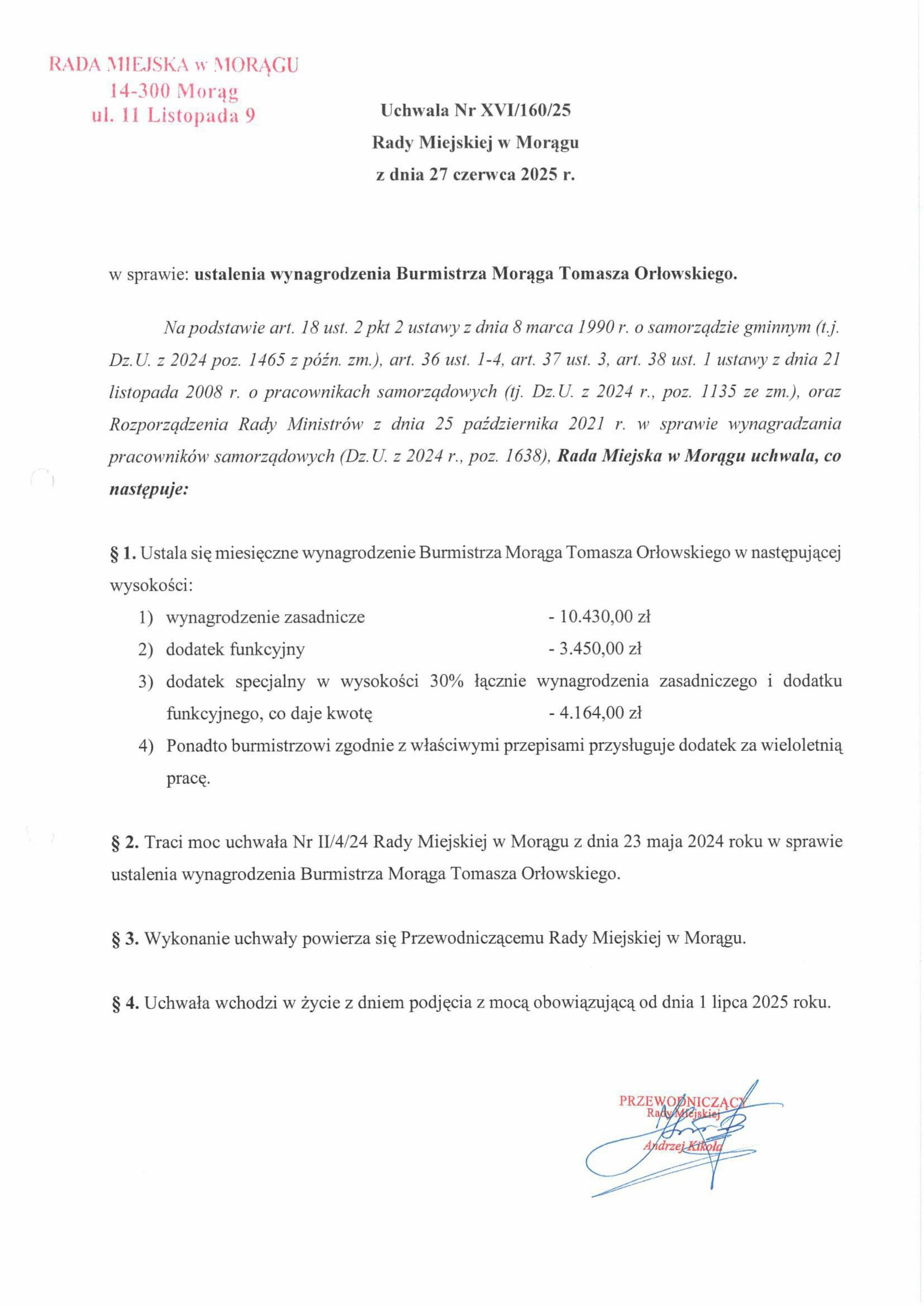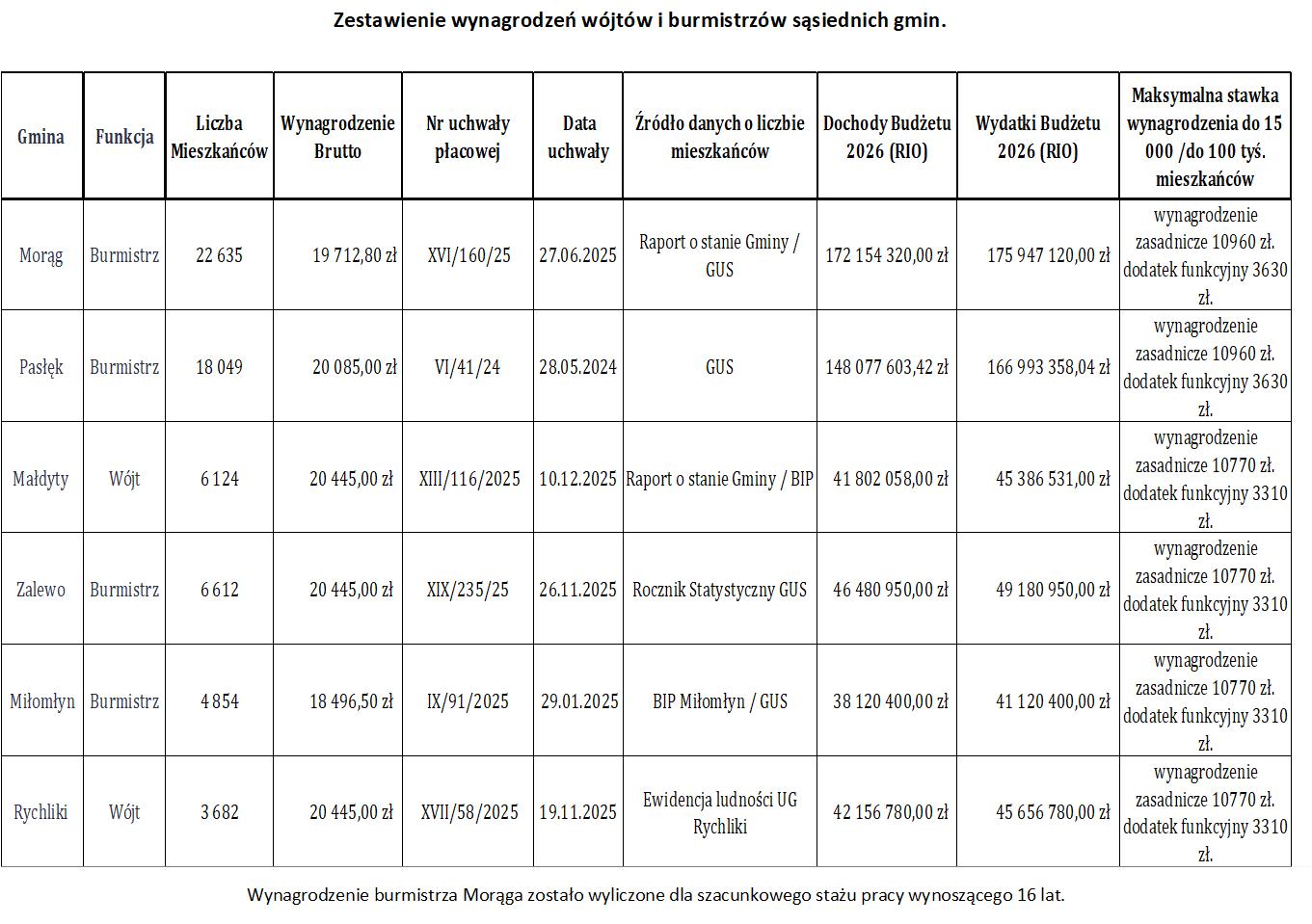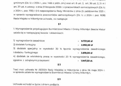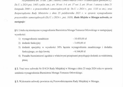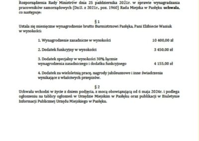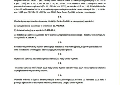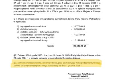 Poniżej prezentujemy uchwały, które przywołaliśmy w powyższej tabeli. Największą ciekawostką, z nich wynikającą jest fakt, że tylko burmistrz Zalewa jako jedyny w przytoczonym przez nas gronie samorządowców dostał podwyżkę bez wyrównania. W uchwale Rady Zalewa jest zapis, że pensja według nowej uchwały będzie naliczana od 1.12.2025r. Pozostali samorządowcy otrzymają wyrównanie od pierwszego lipca 2025 roku bo tak zostało zapisane w rozporządzeniu.