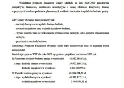 W trakcie ostatniej w 2025 roku, XIII sesji Rady Gminy Małdyty uchwalono najnowszą Wieloletnią Prognozę Finansową na lata 2026–2029. Ta dość tajemnicza nazwa skrywa bardzo ważne dane, które niosą informację o tym, co będzie się działo w naszej gminie i z naszą gminą przez kolejne trzy lata.