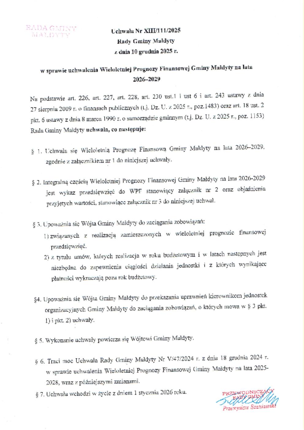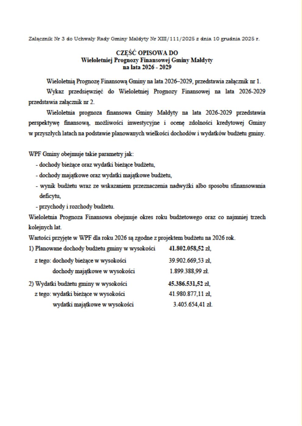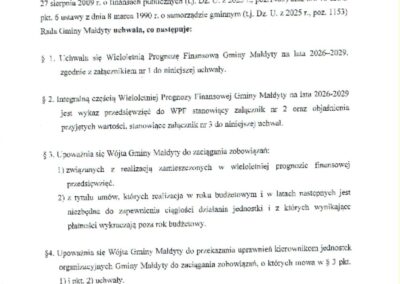 Pierwsze i zasadnicze znaczenie Wieloletniej Prognozy Finansowej dla Gminy Małdyty: uchwalenie prognozy stanowi podstawę do sformułowania budżetu na rok 2026.